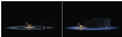 传统舞蹈剧受限于线性时间流,而融入多媒体技术的《只此青绿》创造性地采用“时空折叠”架构。作品以故宫研究员(展卷人)的视角开启,舞者“展卷人”通过在不同的圆形可转动式的舞台运动进入不同的时空节点,聚焦砚台进入宋代制墨场。当旋转式的舞台切换背景至织绢现场,展卷人带领观众走进织女的织绢画境。这种非线性叙事结构将原剧中“展卷、问篆、唱丝、寻石、习笔、淬墨、入画”七个段落转化为可自由探索的立体网络。