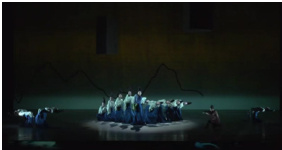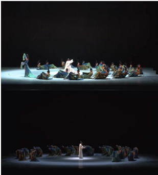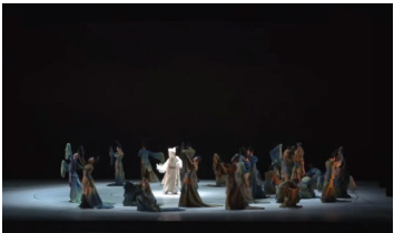 笔者认为多媒体技术应用于舞蹈中固然重要,但从以上的多媒体技术运用来看,有一个对舞者舞动幅度极大限制的影响因素,同心圆结构的可移动电子旋转舞台在进行分层旋转时对舞蹈演员、舞蹈编导完成和设计舞蹈动作的幅度、难易程度等方面有着一定的约束,首先演员在舞蹈时需要脚下地面的稳定性,在应对这一电动舞台时,我们可以很清晰地看到舞者的舞蹈动作风格更偏向于安静、文雅、清新,动作以动静态结合,并且在舞台转动时舞者的动作以静态居多,因此在观众的视觉角度上难免会觉得缺乏更多跌宕起伏式的动作设计。其次,舞蹈的队形变化也同样受舞台空间分层的限制,整部舞剧在四层电子旋转舞台同步启动时,舞者群舞时队形略显单一,仍然以静态为主,舞蹈队形也并未出现大幅度的队形变化,因此在视觉效果上更多的是对画卷的复刻,缺乏一定的灵动层次。最后,多媒体技术的应用虽然对舞蹈起到一定的辅助作用,但是二者需要相互辅助相互成就,过度的技术运用,会使舞蹈部分难以发挥到极致,甚至限制舞的可发展空间。