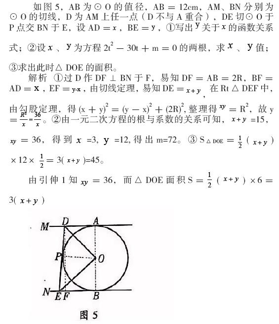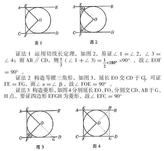 以人教版教材的习题为例,如图 1,AB、CD 为 ⨀ O 的切线,AB ∥ CD,EF 为 ⨀0 的切线,分别交 AB、CD 于 E、F 点,求证∠