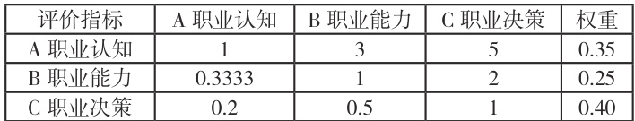 邀请 15 位职业规划领域专家对模型维度进行两两比较,采用1-9 标度法进行打分,1 表示两个因素同等重要,3 表示一个因素比另一个稍重要,5 表示明显重要,7 表示强烈重要,9 表示极端重要。构建判断矩阵。根据专家对职业认知、职业能力与职业决策三个维度的比较结果,构建判断矩阵 A。计算各维度的权重,结果如表2 所示。