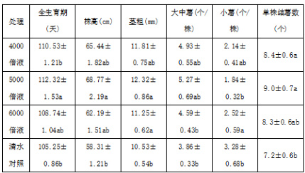 3.1 不同浓度 0.02% 二氢卟吩铁可溶粉剂对马铃薯生长的影响由表 2 可知, 0.02% 二氢卟吩铁可溶粉剂 4000 倍、5000 倍、6000 倍与清水对马铃薯生长的影响存在显著差异。0.02% 二氢卟吩铁可溶粉剂能够延长马铃薯的全生育期,增加马铃薯株高、茎粗、大中薯个数、单株结薯数,减少小薯个数。其中 5000 倍0.02% 二氢卟吩铁可溶粉剂的影响最佳,全生育期、株高、茎粗、大中薯、小薯、单株结薯数分别为 112.3±1.5d、68.7±2.1cm、12.3±0.8mm、5.2±0.6 个 / 株、 1.8±0.3 个/株、 9.0±0.7 个( P<0.05 ),差异具有统计学意义。