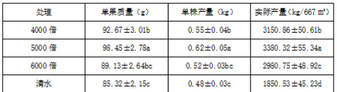 3.2 不同浓度 0.02% 二氢卟吩铁可溶粉剂对马铃薯产量的影响由表 3 可知, 0.02% 二氢卟吩铁可溶粉剂 4000 倍、5000 倍、6000 倍与清水对马铃薯产量的影响存在显著差异。0.02% 二氢卟吩铁可溶粉剂能够增加单果质量、单株产量以及实际产量。其 中 5000 倍 0.02% 二氢卟吩铁可溶粉剂的影响最佳,单果质量、单株产量以及实际产量分别为 98.45±2.78g、 0.62±0.05kg 、2380.30±55.30kg/667 ㎡( P<0.05 ),差异具有统计学意义。