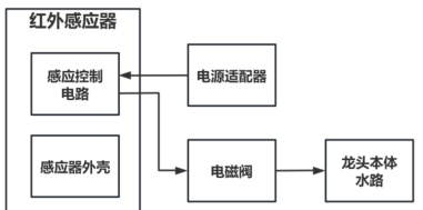 图 1 是感应控制器的系统总体框架图,包含了龙头本体水路,是用于水路出水。电磁阀具有控制水路的开和关功能。电源适配器将市电 220V 转换为 6V,用于感应控制器供电。感应器外壳是将线路板装配在外壳里,具有防水防潮,保护线路板正常工作的功能。感应控制电路:具有微控制器,电压转换电路、红外传感器模块,驱动电路,自动调节感应距离模块;