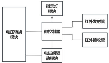 图2 是感应控制电路的硬件框架图,包含电压转换模块、微控制器、指示灯模块、电磁阀驱动模块、红外发射管、红外接收管共 6 部分。