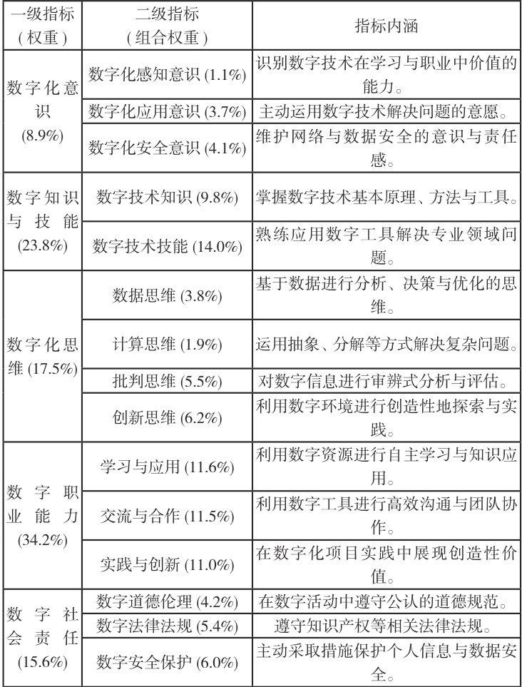 表1 泰安市高职学生数字素养评价模型指标及权重
