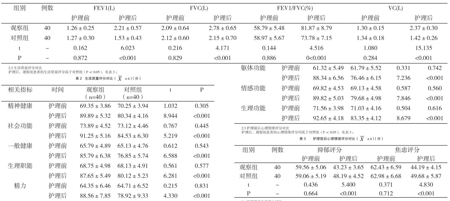 护理后,观察组患者肺功能指标均优于对照组 (P<0.05 ),见表1 ;