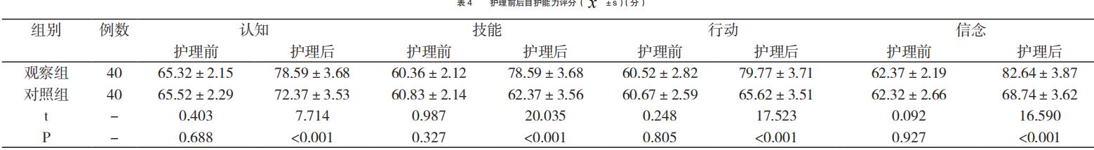 2.4 护理前后自护能力评分护理后,观察组患者的自护能力评分高于对照组(P <0.05),见表4 ;