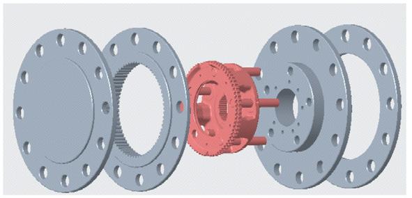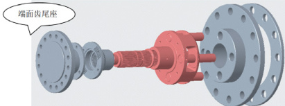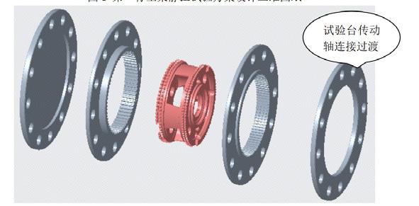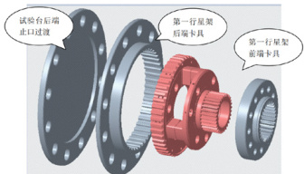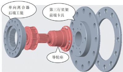 单向离合器结构示意图见图 5、图 6 标注砖红色部分。图 5 中 1# 单向离合器前端和导轮座通过花键连接,导轮座底部带有非均布的 8 个通孔。分析导轮座 8 个通孔的分度圆及大小,可以考虑利用第三行星架前端卡具实现导轮座和传动轴的连接,因此在第三行星架前端卡具的基础上设计出和导轮座连接的 8 个非均布通孔。这样设计出的第三行星架前端卡具即可以实现和第三行星架的连接,也可以实现和单向离合器的连接,能够完成两种类型的静扭试验,减少了试验工装的加工数量,节省了试验成本。单向离合器后端卡具根据离合器外花键参数设有与之配合的内花键,两侧通过单向离合器压片进行固定,此外工装后端设有止口和均布通孔与试验台尾座进行连接。