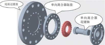 根据图 6 中 2# 单向离合器的结构和实际动作工况设计单向离合器隔套,实现隔套内花键与单向离合器内花键配合,后端通过止口和均布通孔与尾座过渡盘通过螺栓连接固定。单向离合器花键轴后端根据离合器内花键设计与之配合的外花键,考虑到工装的强度、轴的尺寸以及试验台现有工装,离合器花键轴前端则选用二轴花键参数,同时为了便于加工,中间轴径均小于两端花键轴径。