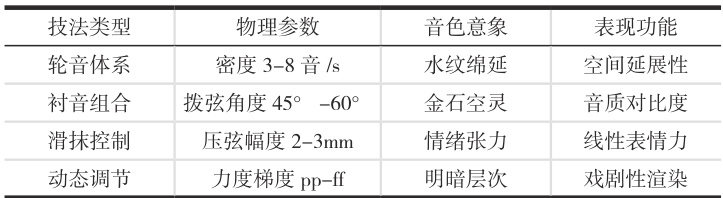 15-20mm 时音色温润,接近山口 5-10mm 区域则清冽通透;力度范围覆盖30-90dB 声压级,配合正反竹交替形成明暗层次。此多维技法体系构成表 1 所示音色控制模型。该模型证实技法与音色存在强关联性:高密度轮音配合弱力度 ( ⩽50dB) 呈现雾气氤氲,反竹强奏 Φ(≡8001B) 结合中高音区爆发惊涛之势。音色控制四维协同实现自然意象到人文情感的转译。