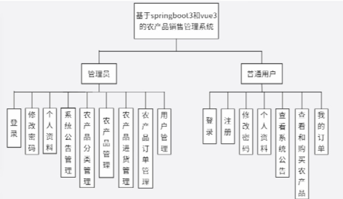 系统的模块根据业务需求和功能特点进行划分,主要包括用户管理模块、农产品管理模块、农产品订单管理模块、农产品订单管理模块等。现将所有功能以系统结构图的形式呈现,如下图1 所示: