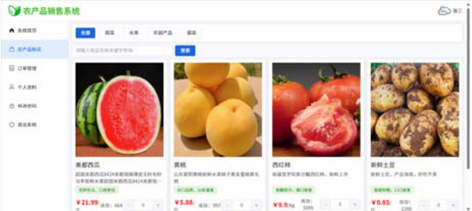 系统针对不同地用户开展了需求调查,完成了数据库结构设计,优化了代码性能,使得系统地运行更加稳定可靠。用户可以通过前端完成农产品购买、查看公告、修改个人信息等操作。管理员则可以在后台对用户账号、管理员权限、农产品信息及分类等进行管理。