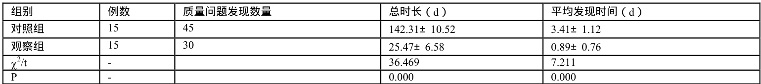 观察组质量问题发现及时性高于对照组, P<0.05 。见表 1