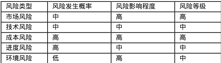 从上述表格可以看出,市场风险和成本风险的等级为高,需要项目管理人员重点关注和应对;技术风险、进度风险和环境风险的等级为中,也需采取相应的措施进行管控。
