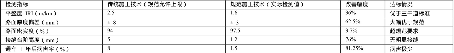 从表格数据可知,采用规范施工技术后,路面平整度 IRI 从 2.5m/km 降至1.6m/km ,改善 36% ,远超主干道规范要求;路面厚度偏差等关键指标改善超 60% ,通车 1 年后病害率从 8% 降至 1.5% ,证明科学施工技术对提升道路平整度效果显著。