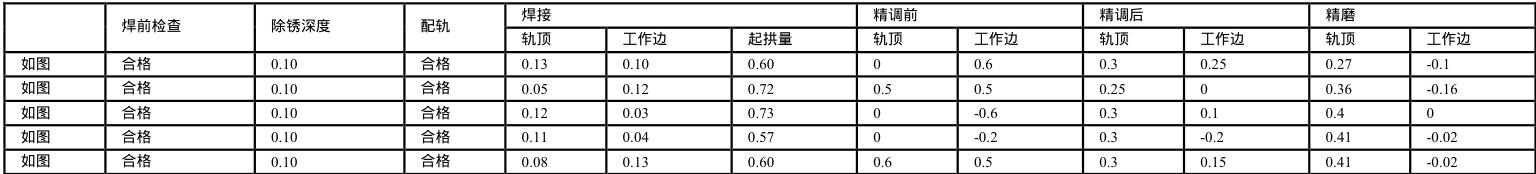 以下我们汇集了 2011 年 7 月份生产的 5 组焊缝,设计时速 160km/h,经过焊接、24 小时以上的时效、外观精整处理、成品检查入库工序,期间环境气温基本保持在 20℃~30℃左右,日夜温差不大,我们跟踪了焊前检查、除锈、配轨、焊接、精矫直、精磨等岗位,并进行标准化作业控制,参考成品入库的平直度曲线,检验控制效果。