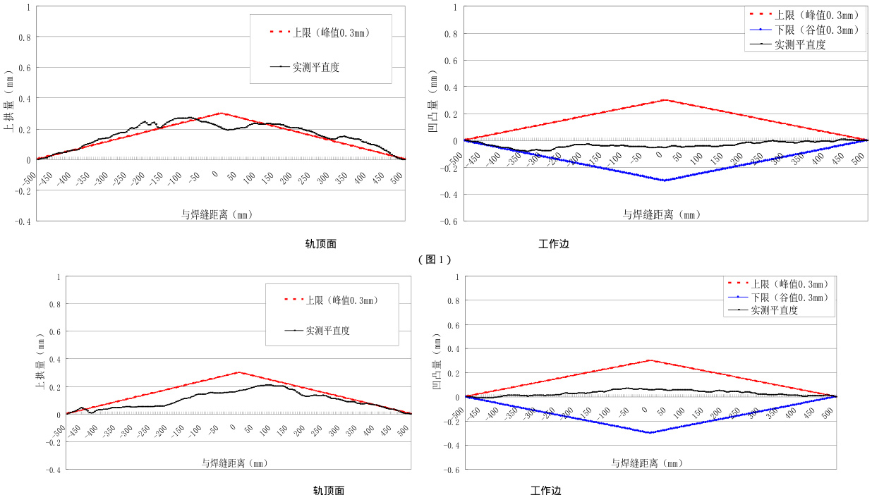 图 1~图 2 电子尺曲线均为设计速度 160km/h 成品入库的最终数据,从几组平直度曲线来看,完全满足TB/T1632 焊轨外观平直度的标准要求。焊接作业过程我们分别对焊前检查、除锈、配轨、焊接、精调直、精磨和平直度检验等各道工序进行标准化作业控制,特别是对配轨岗位的不对称环节加以重视,焊接后测量工作边错边可以控制在 0.10mm 范围内,焊接中的起拱量控制在 0.6mm 左右,选择几何尺寸相近的钢轨配焊,焊接后轨顶面相错也可以保持在 0.1mm 范围内,焊缝经过大于 24 小时的时效处理,应力得到充分释放,这里值得推敲的是,焊缝经过仿型处理,我们在精调直岗位之前测量时发现,焊缝轨顶面和工作边都有一定程度的形变,特别是工作边变化较大,究其原因,我们确定钢轨在辊道走行过程中导致工作边的形变,并非钢轨自身原因所致,所以形变亦在可控范围内,整个焊缝状况良好,适合精调直处理,精调直后轨顶面抛物线趋势明显,工作边曲线合格,精调直前轨顶面较高,精调直作业时对该焊缝施加一定压力,放置成品垛位后,焊缝向上有所反弹,经过人工修磨处理,曲线的最终结果不如精磨后的趋势,所以尽量减少人工打磨。纵观该组焊缝情况,我们通过对各岗位标准化控制,取得了比较理想的效果,外观质量有了明显的改善,对今后工作有一定的借鉴。