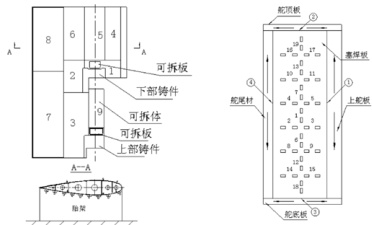 15) 装配上舵板,按图2 左侧所示顺序安装,上舵板与横、纵筋板间焊后,经检查人员检查后,报请船东,船检检验。封件 7、件8 塞焊板。
