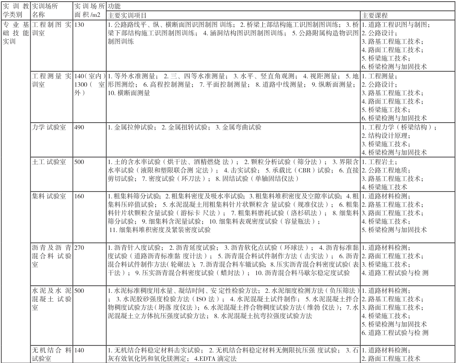 依据教育部发布的《高等职业学校道路桥梁工程技术专业 教学标准》《高等职业学校道路桥梁工程技术专业 实训教学条件建设标准》《高等职业学校道路桥梁工程技术专业 专业简介》和交通部发布的《公路水运工程试验检测机构等级标准》《公路水运工程试验检测管理办法》,以及本校实际情况进行道桥专业实验室建设。