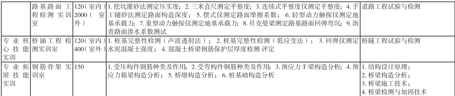 高职道桥专业实验实训教学与工程实践应紧密结合,优化高职道桥专业实验实训项目,实训场所面积、采光、照明、通风等应满足相关要求,配齐实验实训教学设备,标准化室实验室与学校室外实训场、校外实习实训基地合理规划、相辅相成,形成一个科学、合理、完善的实践教学体系,实现校内校外实验实训的连贯性,使培养的人才满足用人单位的需求。