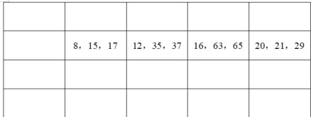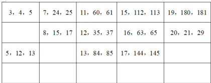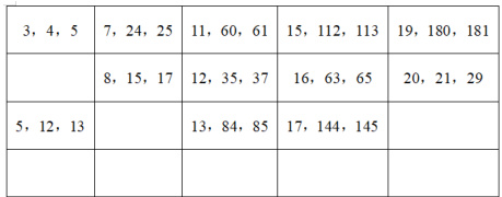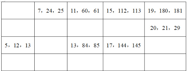 如图(3),我们能发现,每组勾股数的三个数中,恰好只有一个偶数,其余两个是奇数(事实上,互质的三个数中,有且只有一个偶数。这一点大家可以自行证明)。偶数的表示法比较简便,不妨用 2m 表示,以勾股数 3-4-5 为例, 2m=4 ,则 m=2=2×1 ,3=22-1,5=22+1 。这一类数中,两个奇数相差 2,可以表示为2m,m2-1,m2+1 ,还适用 8-15-17、12-35-37、16-63-65 这几组勾股数。剩余的勾股数为两个奇数之差不为2 的勾股数,如图(4):