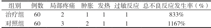 治疗期间,治疗组出现不良反应 5 例( 8.33% ),其中局部疼痛 2 例,肿胀 1 例,发热 1 例,过敏反应 1 例;对照组出现不良反应 7 例(11.67%),其中局部疼痛 3 例,肿胀 2 例,发热 1例,过敏反应 1 例。两组不良反应发生率比较差异无统计学意义(χ²=0.384,P=0.535)。具体数据见表 1。