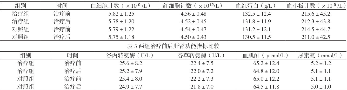 治疗前后,两组血常规、肝肾功能等安全性指标均在正常范围内波动,且组间比较差异无统计学意义( P>0.05 )。具体数据见表2、表3。