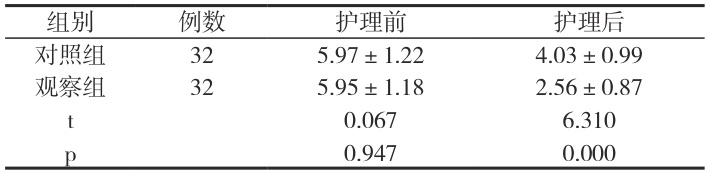 对比分析发现,观察组护理后疼痛评分低于对照组( P<0.05 ),见表1。