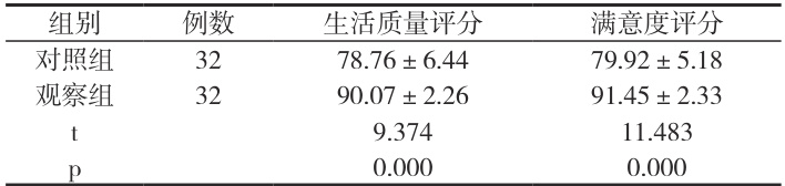 对比数据可以看出,观察组生活质量及满意度评分均高于对照组( P<0.05 ),见表 2