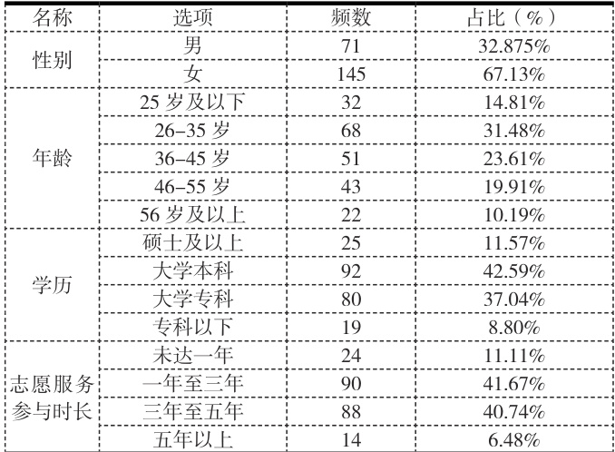 通过线下走访社区,向参与社区养老志愿服务的志愿者发放问卷进行调查,问卷共包含 4 个基础题,18 个表题,1 个多选题,共收集有效问卷 216 份。受访志愿者信息详见表1。