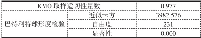 效度,是指问卷的有效性和准确性,通过 KMO 值分析数据合理性。KMO 值高于 0.8 时,表示效度很好,研究数据非常适合提取信息。如表 3.3所示,KMO 值为 0.977,高于 0.8,显著性概率值低于 0.001,表明效度好。