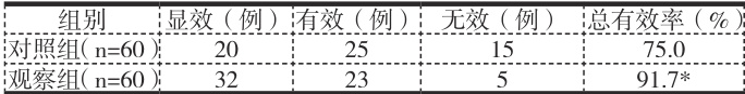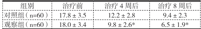 对照组中,男34 例,女26 例;年龄 20~65 岁,平均( 42.3±8.7 )岁;病程 1~15 年。观察组中,男33 例,女27 例;年龄 21~67 岁,平均( 43.1±8.4 )岁;病程 1~16 年。两组性别、年龄、病程差异无统计学意义( P>0.05 ),具有可比性。