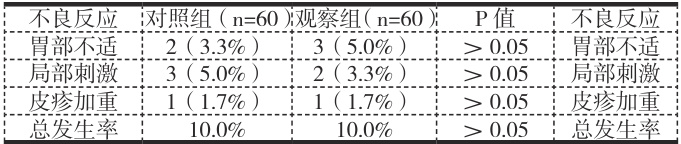 两组治疗期间的不良反应发生率均为 10.0% ,差异无统计学意义(P>0.05 )。观察组仅有轻度胃部不适或局部刺激反应,未见明显系统性不良事件,说明中西医结合方案安全性较高,患者耐受性良好。与国内相关研究结果一致,如邓宜福(2021)研究表明,润燥止痒胶囊联合外用药可显著降低复发率,改善PASI 评分,其安全性优于单纯西药治疗[4]。