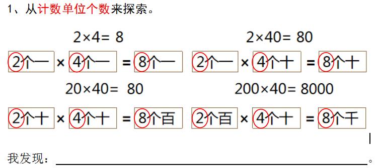 ② 小组合作探索整数乘法中计数单位个数之间有什么规律;