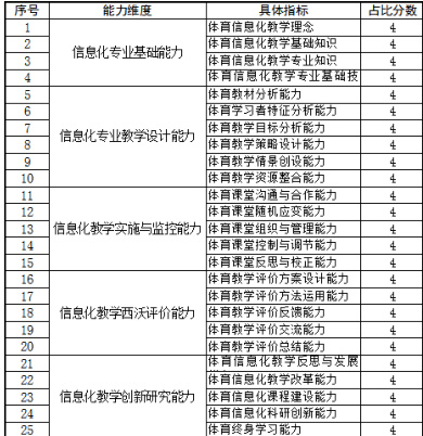 在遵循体育信息化教学的科学性、合理性与实效性等原则前提下,我们运用德尔菲法,邀请信息化教学专家 16 人(高职体育信息化教学专家 3 人、高职主管信息化教学领导 2 人、体育教研室主任 3 人、高校体育学科一线骨干教师 8 人),确定了“信息化专业基础能力、信息化专业教学设计能力、信息化教学实施与监控能力、信息化教学西沃评价能力、信息化教学创新研究能力”等五个维度,具体指标体系不作数据检测,权重占比平均,每项4 分,共100 分。