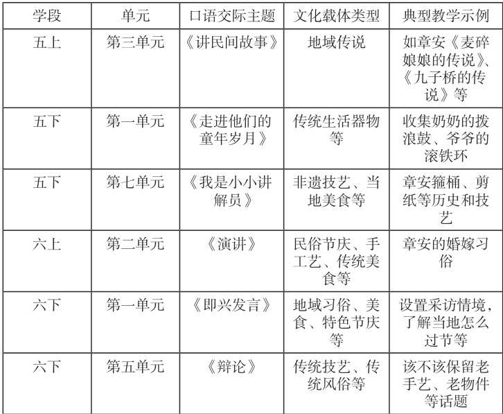 分析梳理五、六年级语文教材发现,除六年级下册有 3 个口语交际专题外,其余各册均有 4 个。共筛选出 6 个与地域文化契合的主题(见表 1),涵盖地域传说、传统生活器物、非遗技艺、民俗节庆等。