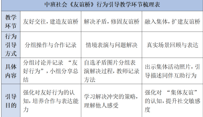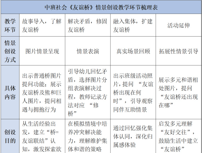 幼儿集体归属感的培养是社会化发展的核心议题,直接影响其心理健康与社会适应能力。当前幼儿园社会活动存在形式化倾向,难以激发深层次情感联结。本文聚焦中班社会活动《友谊桥》,解析“情境创设——行为引导——情感深化” 三维路径对幼儿集体归属感发展的促进作用。