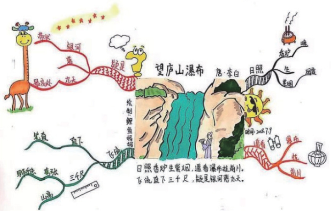 以二年级上册《望庐山瀑布》教学为例,教师引导学生绘制庐山瀑布中心思维导图,先在中心位置绘制瀑布主意象,然后向外辐射“日照香炉生紫烟”表现为阳光照射山峰烟雾缭绕景象,“飞流直下三千尺”表现为水流从高处垂直落下气势,“疑是银河落九天”表现为瀑布如天河倾泻壮观场面,学生在绘制过程中表现出浓厚兴趣,积极参与课堂讨论主动提出疑问和想法,学习积极性显著提高。学生绘制过程中教师适时补充庐山地理位置、庐山瀑布实景图片等资料,帮助学生构建完整庐山瀑布意境。