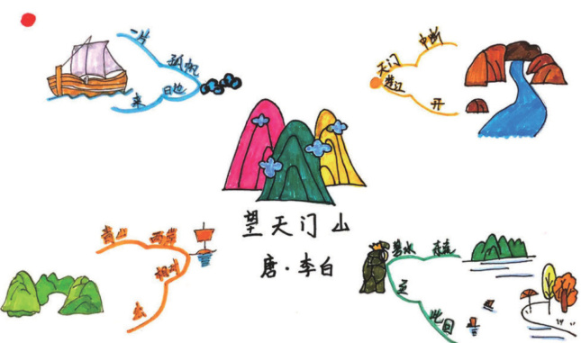 以三年级上册第六单元《望天门山》教学为例,教师指导学生构建天门山风景主题思维导图,中心设置天门山主题,一级分支展开“天门中断楚江开”表现天门山两山对峙中间江水穿流地理特征,“碧水东流至此回”表现江水流向变化奇特景象,“两岸青山相对出”表现两岸山峰隔江对峙壮观场面,“孤帆一片日边来”表现远处小船靠近日落处行驶点睛之笔,各分支下设置二级分支具体包括地理位置、景象特点等细化内容。学生通过绘制过程清晰把握诗文层层递进结构:先整体介绍天门山地理位置再具体描写江水流向特点,然后描述两岸山峰对峙景象,最终点缀远处帆船画面,思维导图将静态文字转化为动态图像,学生理解李白如何运用远 --- 近 --- 远视角变换技巧描绘天门山全景,感受诗人观察视角和表达艺术。