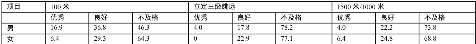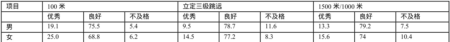 表1 体能成绩优秀率、良好率和不及格率比例表