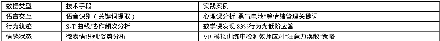 以上三类数据构成互补证据网。语言数据揭示认知焦点(如心理课“ 勇气电池” 隐喻反映情绪管理策略),行为数据量化参与模式(数学课高频低阶应答暴露思维浅表化),情感数据捕捉隐性状态(VR 训练中教师手势变化反映策略有效性)。