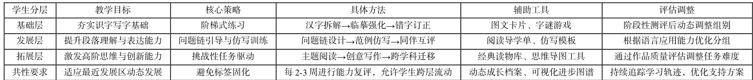 分层教学是破解两极分化难题的核心路径。教师需依据学生识字量、阅读能力、学习习惯等维度进行动态分组,将班级划分为基础层、发展层、拓展层,并制定差异化教学目标与任务(如下图所示)。