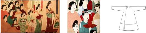 图中侍女主体服装为圆领袍衫(图 3)。这种圆领袍衫是唐代男子最常见的服饰之一,通常为窄袖,典型特征为圆领。其原型为游牧民族为便于骑射而穿的服装,经南北朝民族融合后,成为了隋唐时期男性的主流服饰。 在袍衫外,侍女们于腰间系有一条皮革制成的腰带即革带。革带是唐代男性的标志性配饰,用以束腰并悬挂杂物,女性则通常披帛丝带装饰。因此,侍女们对于革带的使用是完全男性化的。