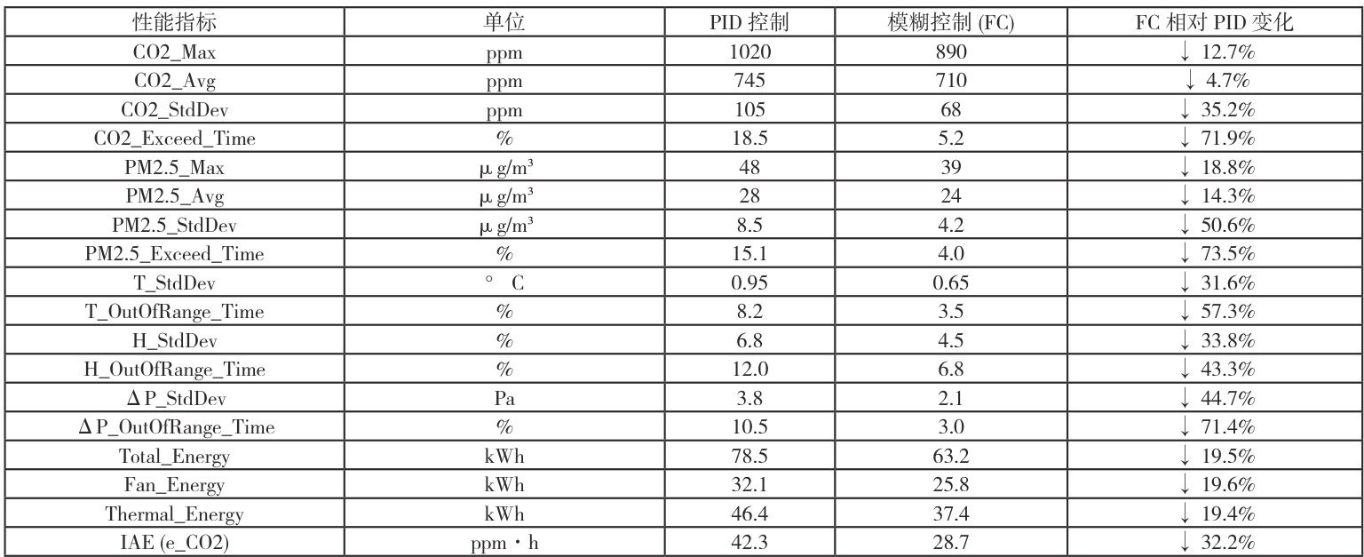 空气质量方面,FC 在各项关键空气质量指标上比 PID 更具优势,CO2 和 PM2.5 的波动性,也就是StdDev,分别下降了 35.2% 和 50.6% ,这意味着 FC 可更稳定地维持室内污染物浓度,更值得注意的是,污染物超标时间,即 Exceed_Time,大幅减少了 70% 以上,极大地提升了空气质量保障的可靠性,这对于手术室来说非常关键。热舒适与压差方面,FC 在温湿度稳定性以及压差控制精度上同样呈现出优势,标准差分别降低了 31.6% 、 33.8% 和 44.7% ,超出舒适或设定范围的时间较大减少,幅度在 43% 到 71% 之间,FC 可协调多变量控制,能耗方面,最让人惊喜的结果是,在提升空气质量稳定性和保障率的 FC 系统的总能耗降低了 19.5% ,其中风机能耗降低了 19.6% ,冷热源能耗降低了 19.4% 。节能主要源于以下几点:预见性调节,利用人员密度预测,在人员聚集前提前小幅提高风量,避免了 PID 在污染突然增加时的剧烈响应,也就是大幅提速,以及后续的振荡调整过程,使得风机运行更加平稳高效,协同优化,模糊规则综合考虑了新风引入,也就是冷热负荷,和回风利用,也就是节能潜力之间的平衡。比如在室外空气质量良好且负荷允许时,FC 会适当增大新风比并降低过滤等级或风机转速,就像规则示例 4 那样,减少无效动作,FC 的平滑输出减少了风机、阀门、冷热源设备的频繁启停和大幅调节,降低了过程损耗 [11]。