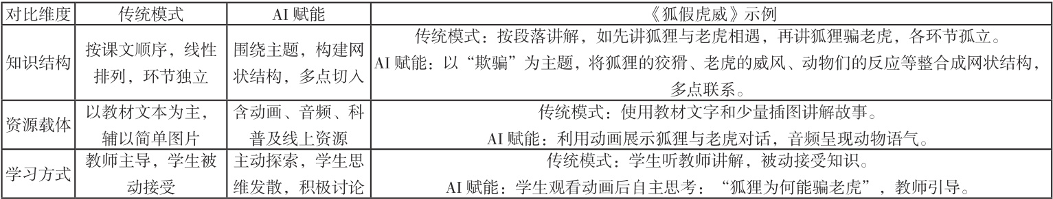 表1- 1 《狐假虎威》传统教学模式和 AI 赋能模式的差异性对比表