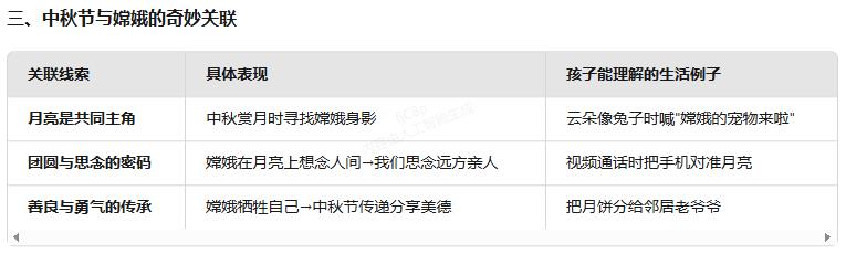 结合AI反馈“中秋节与嫦娥奔月的奇妙关联”表格(如图1-4所示),引导学生探寻“中秋节日”与“嫦娥奔月”的关联性。