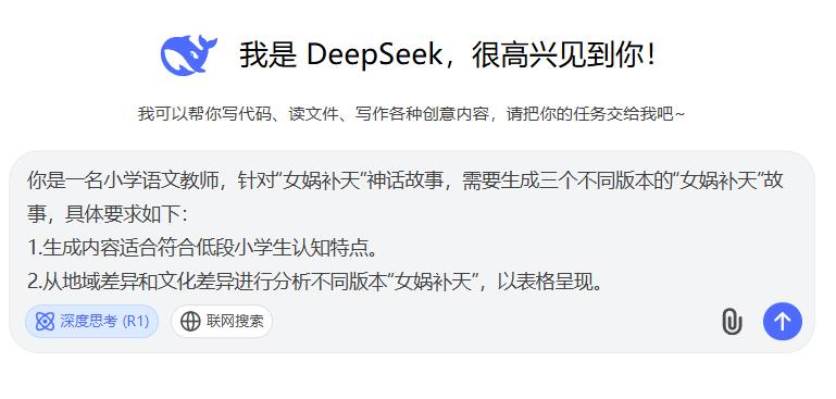 我是DeepSeek,很高兴见到你!我可以帮你写代码、读文件、写作各种创意内容,请把你的任务交给我吧一你是一名小学语文教师,针对女娲补天“神话故事,需要生成三个不同版本的"女娲补天“故事,具体要求如下: