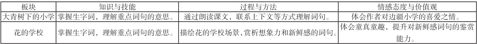 依据宏观目标,从本单元“大青树下的小学”“花的学校”“口语交际与习作”等板块,从知识与技能、过程与方法和情感与价值三个维度细化课时目标,如下表1-3 所示。