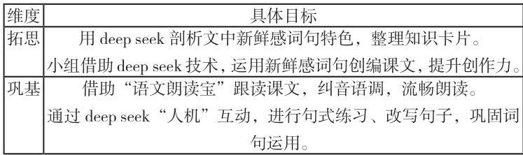 利用智慧云平台分析学生过往学习数据,包括“语言表达”“书面作业”“随堂测试”等过程性、结果性数据,全面了解学生的个体差异性要点,基于“拓思”“巩基”两个维度,构建个性化、分层化目标,细化“过程与方法”维度目标,以《大青树下的小学》为例,具体细化如下表1-4 所示。