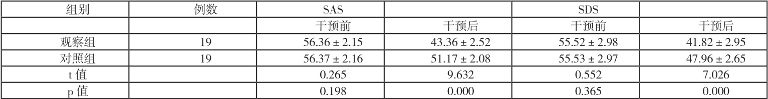 干预前两组 SAS、SDS 评分差异小( P>0.05 ),干预后观察组SAS、SDS 评分均低于对照组( P<0.05 )。